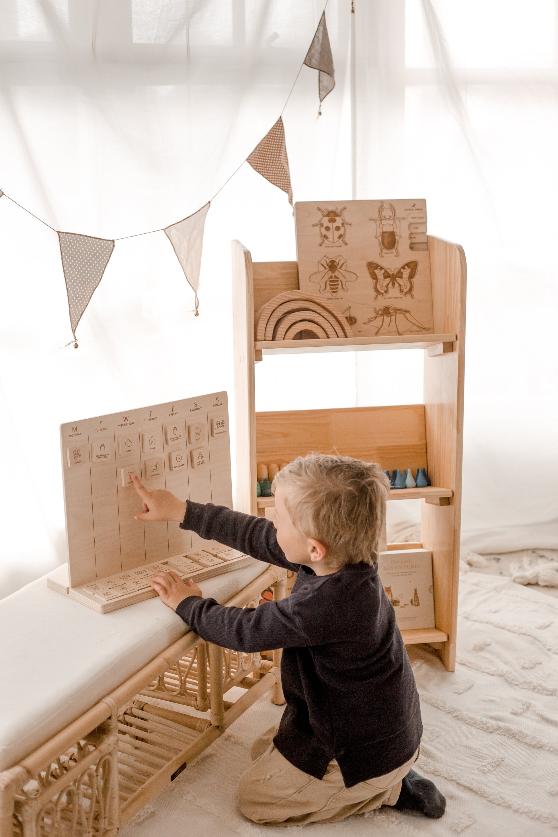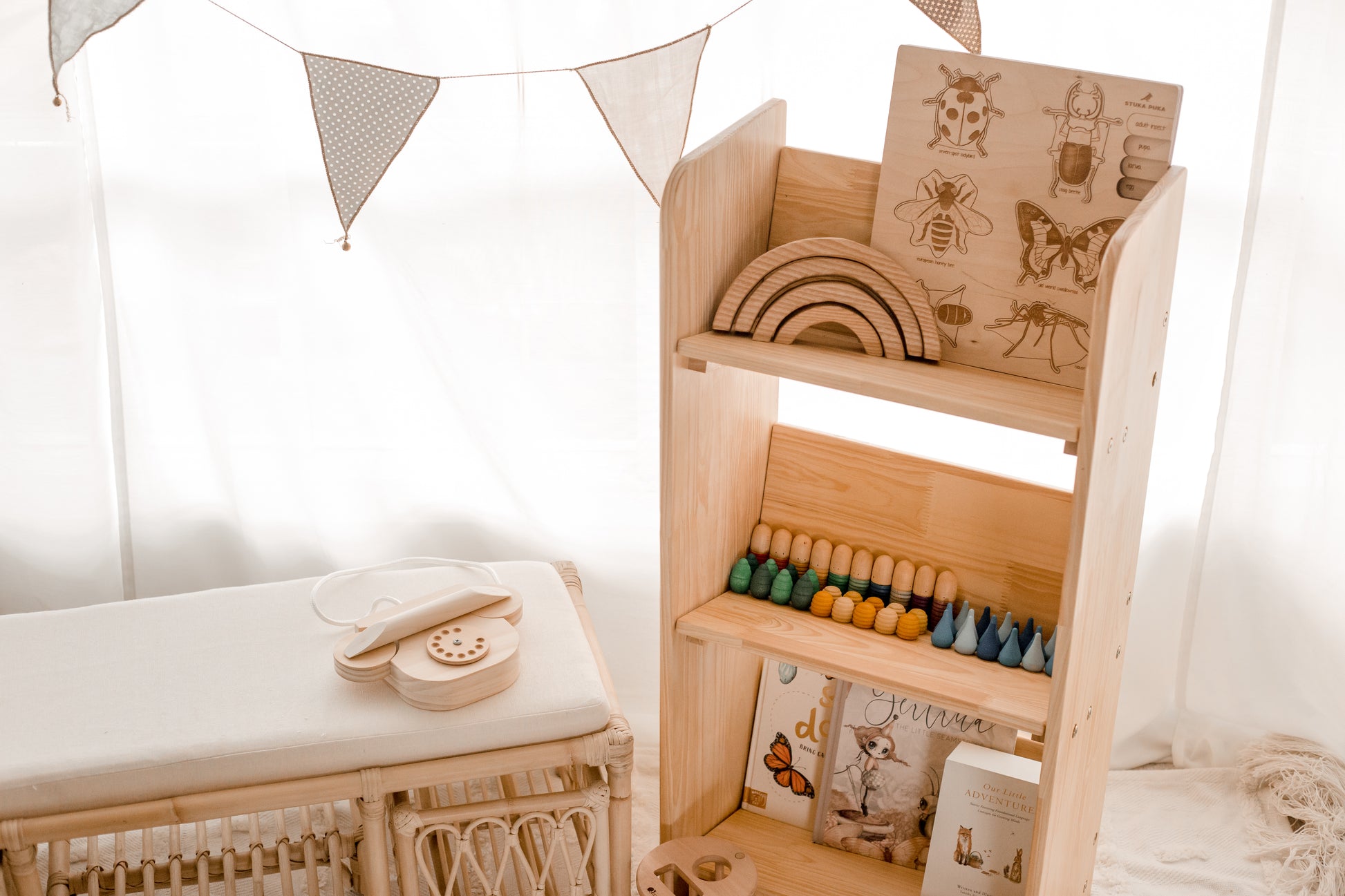 Designed to inspire independence, this toddler-friendly bookshelf makes it easy for little ones to browse, grab, and tidy their favourite books and toys.