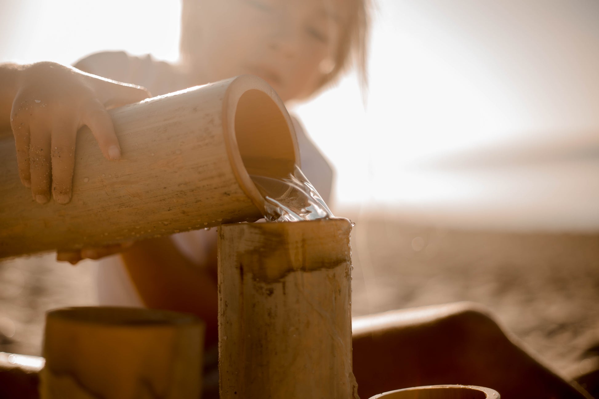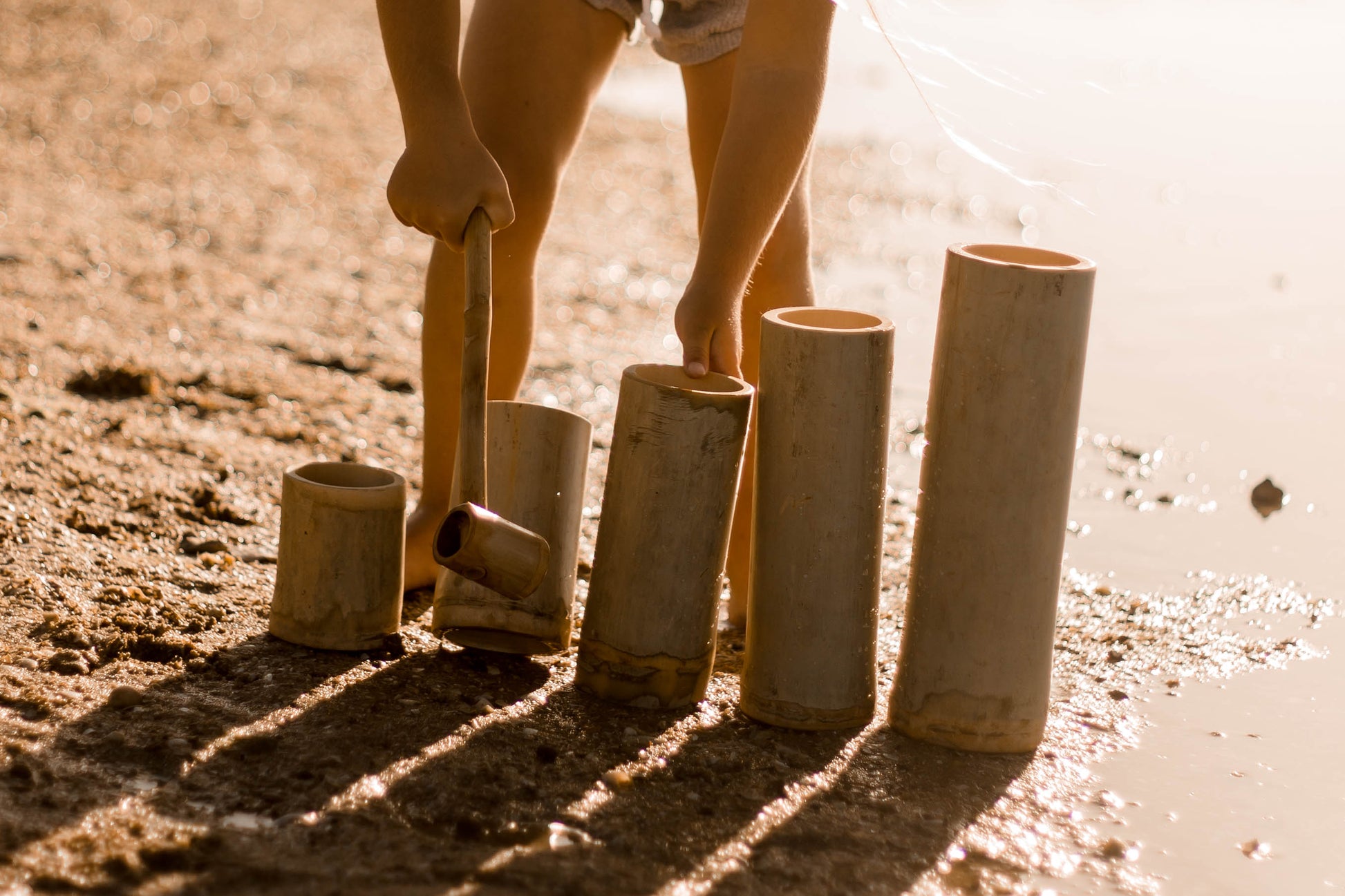 The set includes two bamboo tubes of varying heights, perfect for pouring water from the smaller tube into the taller one. This activity helps children understand measurement basics while enjoying the sensory experience of water play.